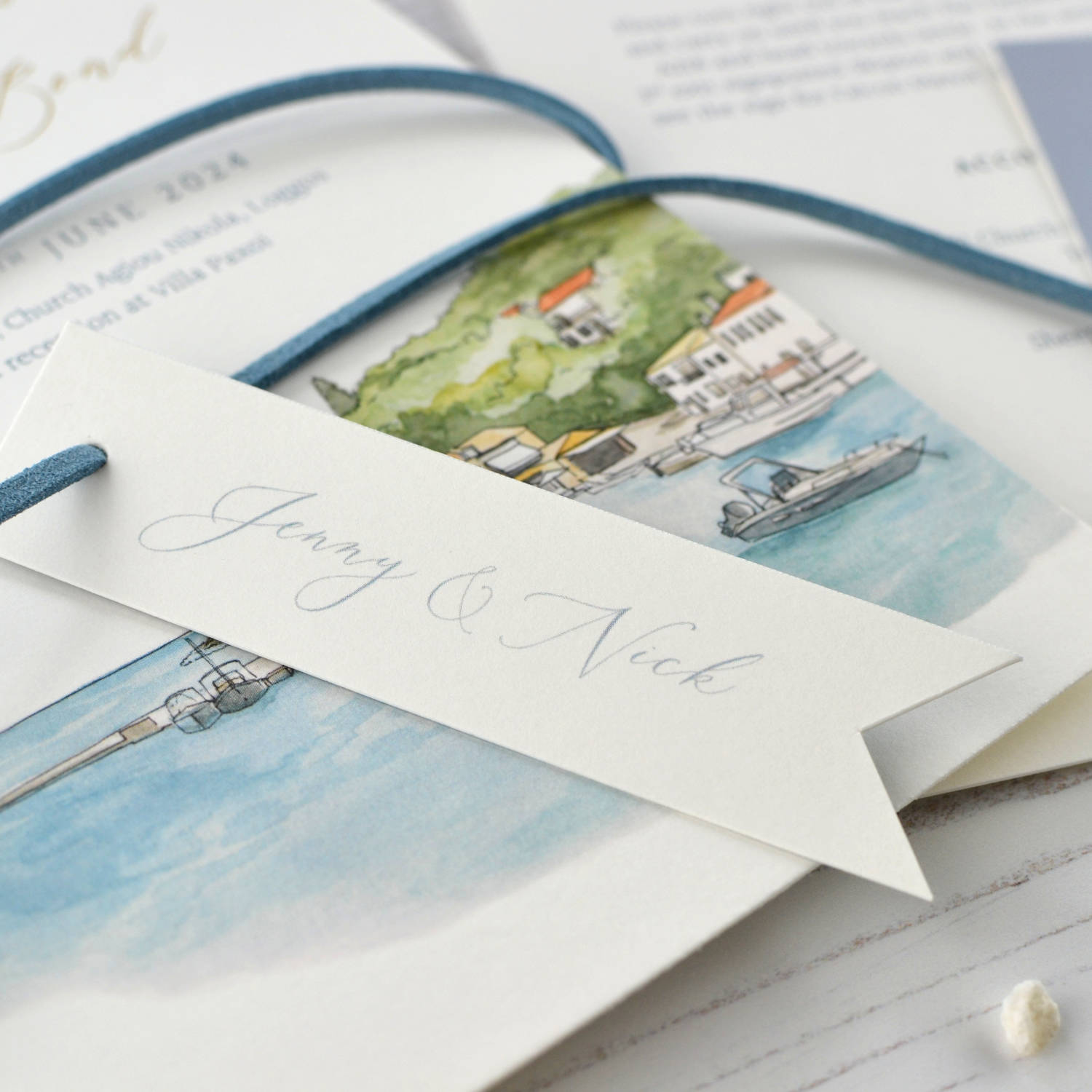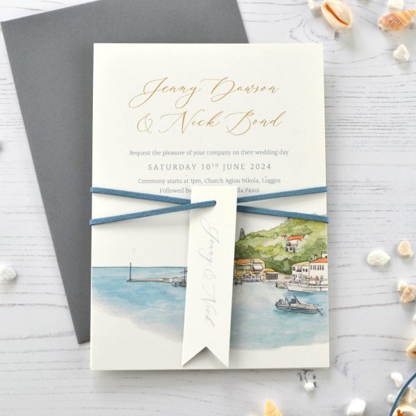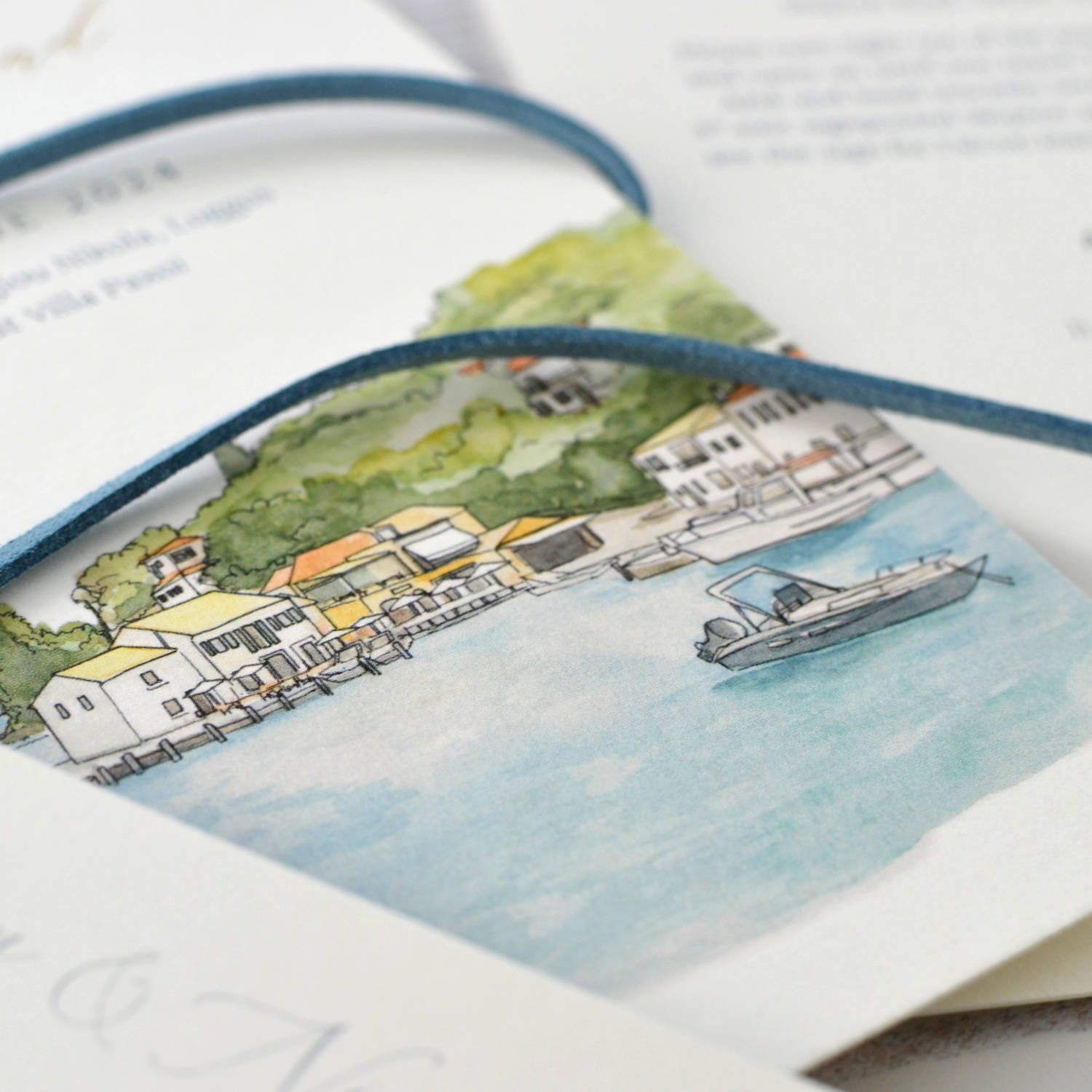 This elegant wedding invitation features a watercolour illustration bespoke to your wedding destination. The sample is for illustrative purposes and cannot be customised.
