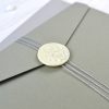 This Tuscan style invitation with a lovely wreath of olive branches, can be customised to suit any style or budget. This sample comes with a green pocketfold and is finished with a wax seal and thread.